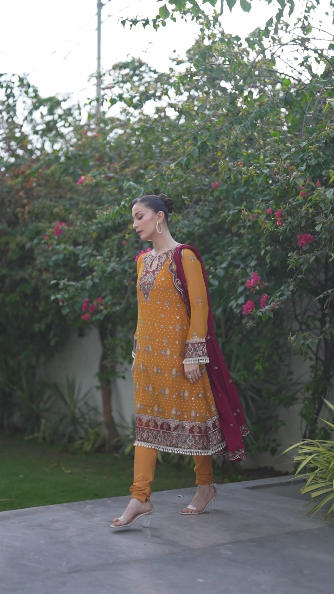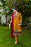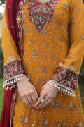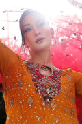 A vibrant orange chiffon ensemble with embroidery on the front, back, and sleeves. Finished with organza neckline and borders, paired with an embroidered chiffon dupatta and dyed raw silk trouser.