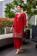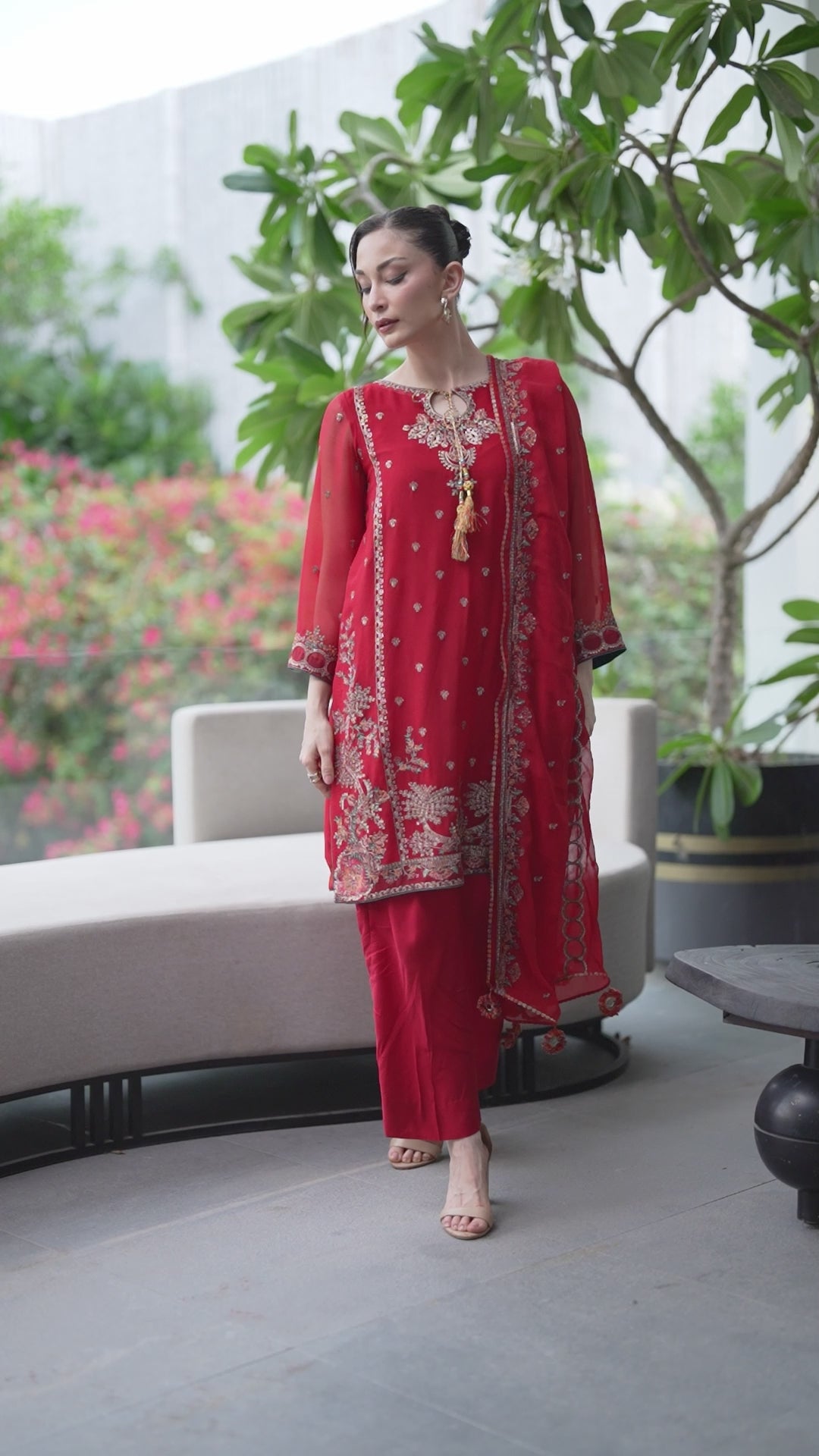 A bold red chiffon ensemble featuring an embroidered front and sleeves, styled with a chiffon embroidered dupatta and plain raw silk trouser. Finished with detailed organza accents for an elegant look.