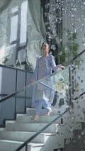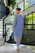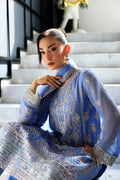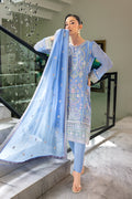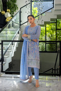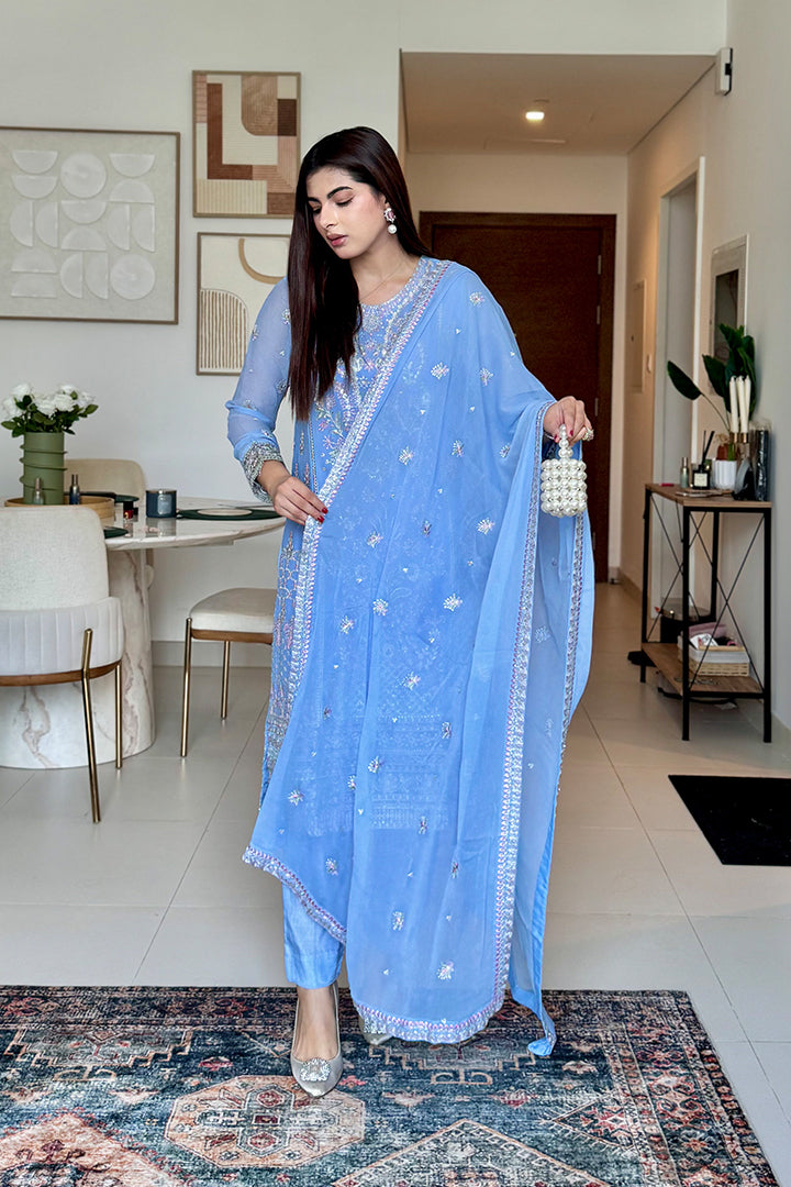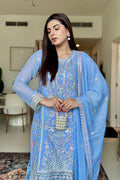 A powder blue chiffon ensemble featuring detailed embroidery on the center and side panels, paired with a matching embroidered dupatta and plain raw silk trouser. Organza borders add a refined finishing touch.