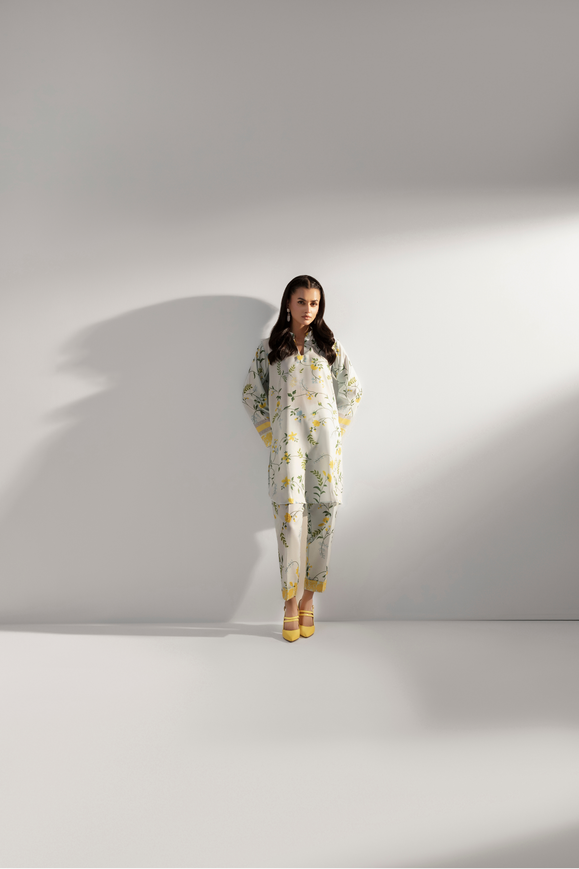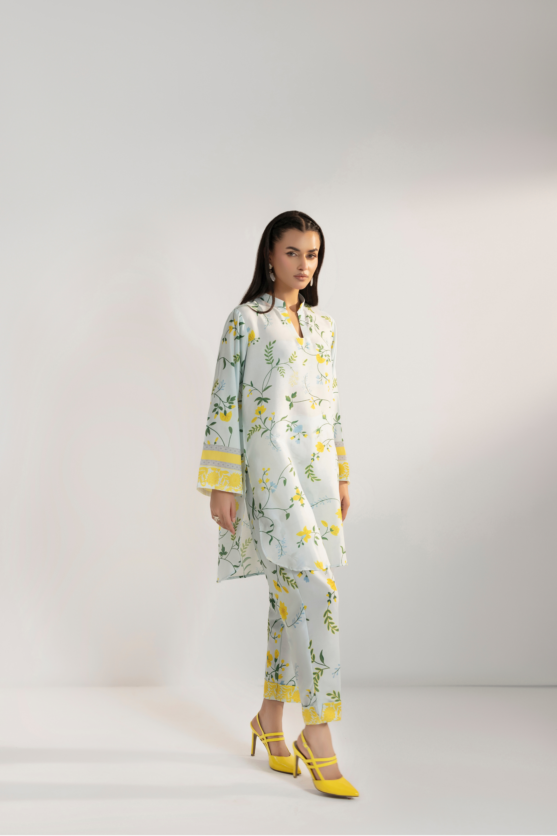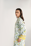 Embrace effortless springtime charm with the Dainty Daffodil ensemble. This fresh, ready-to-wear two-piece suit features delicate yellow floral prints on an off-white canvas, perfect for a light and chic look.