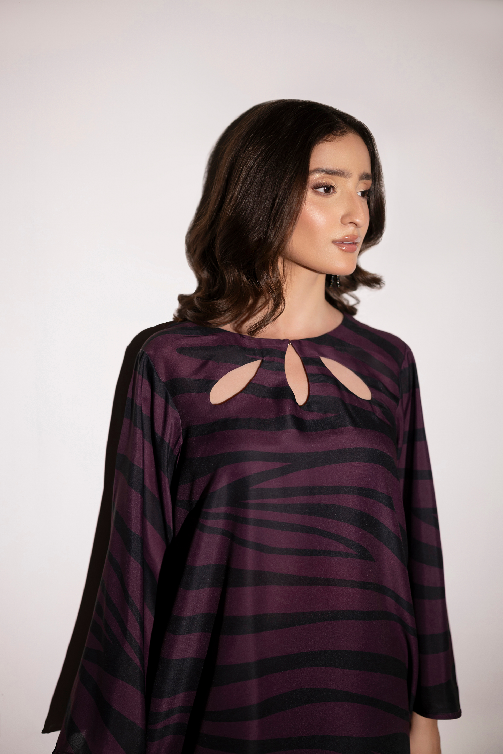 Embrace a fiercely modern look with the Dark Wild ensemble. This ready-to-wear two-piece suit features a distinctive dark print, combining an abstract pattern with a stylish keyhole neckline.