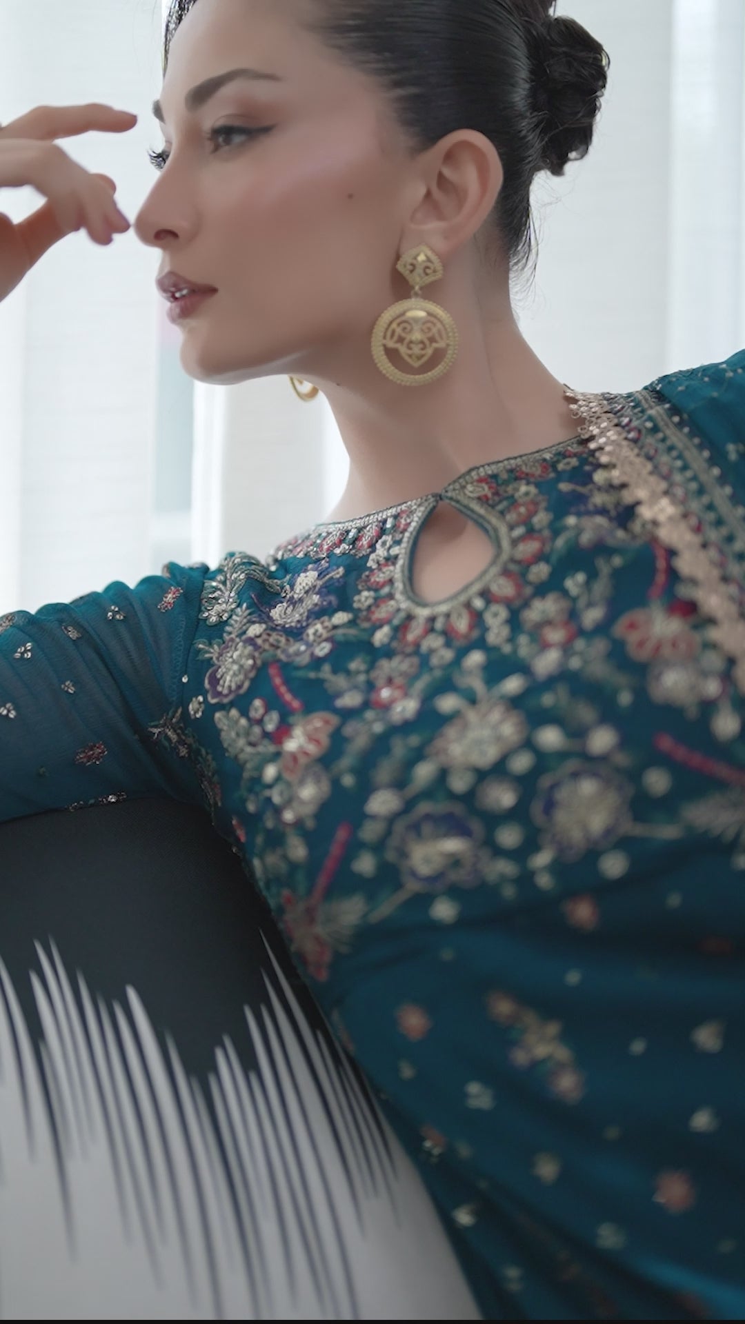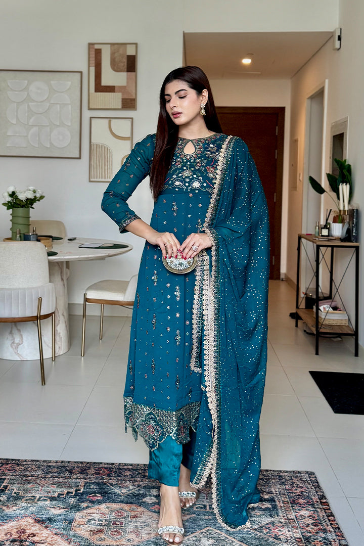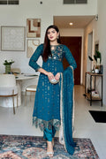 A striking teal chiffon ensemble with embroidered front, sleeves, and neckline, styled with a chiffon embroidered dupatta and dyed silk trouser. Organza borders add a refined finish.
