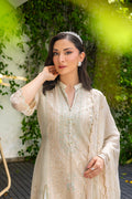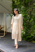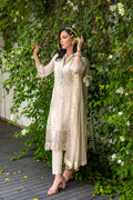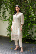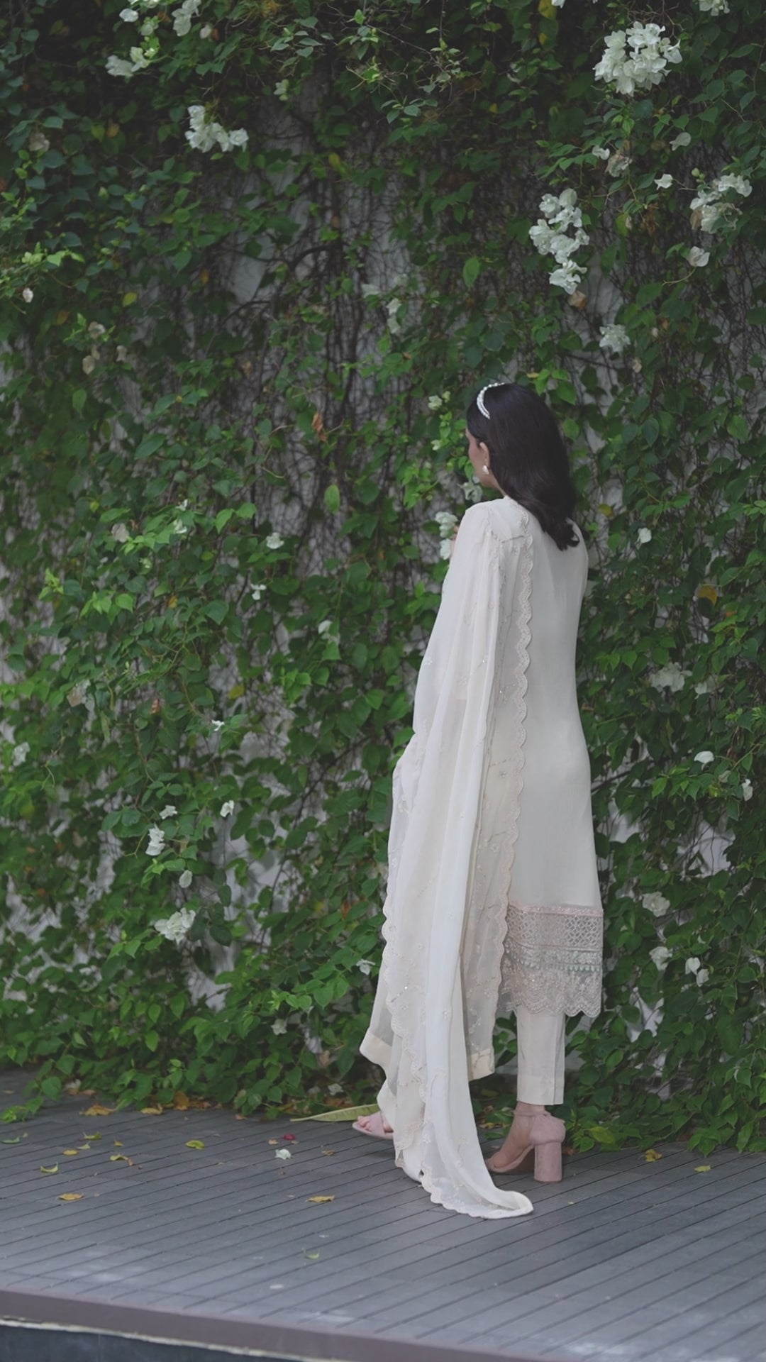 An off-white chiffon ensemble featuring delicate embroidery on airy chiffon, paired with a dyed raw silk trouser for a refined finish.