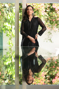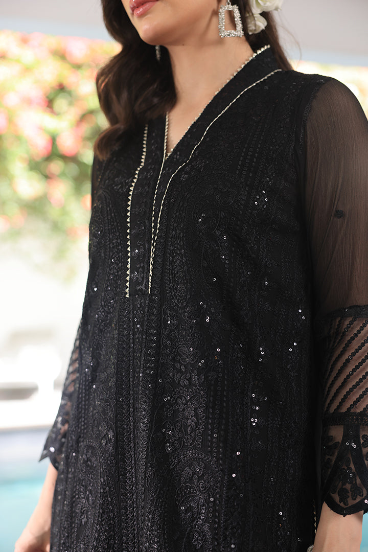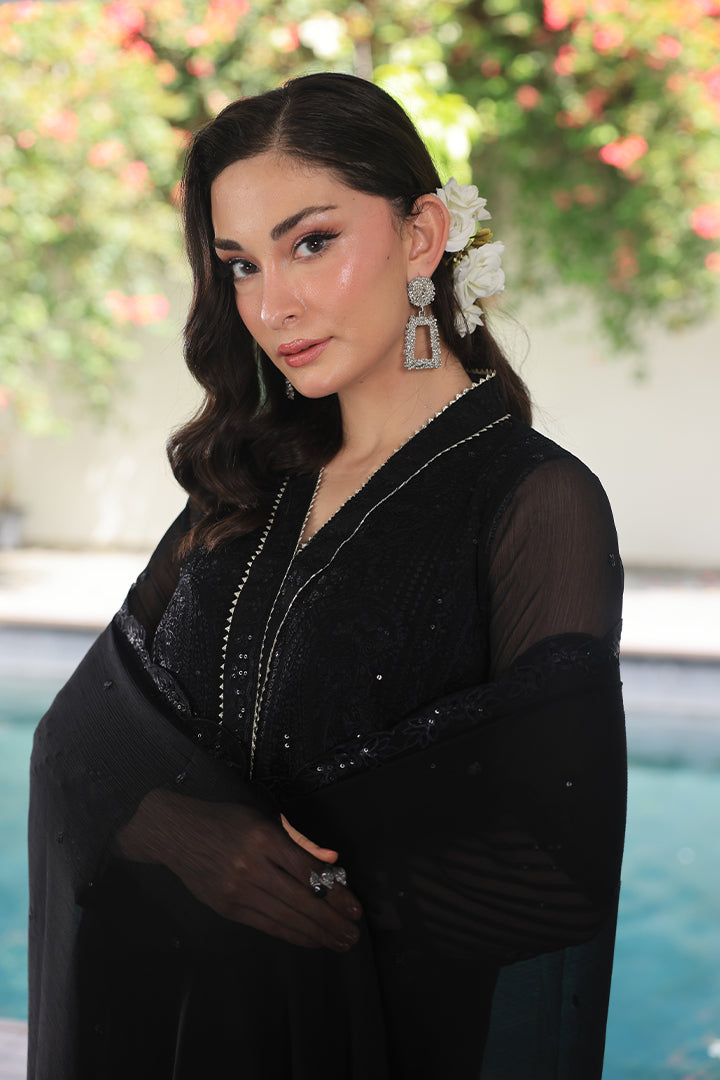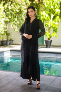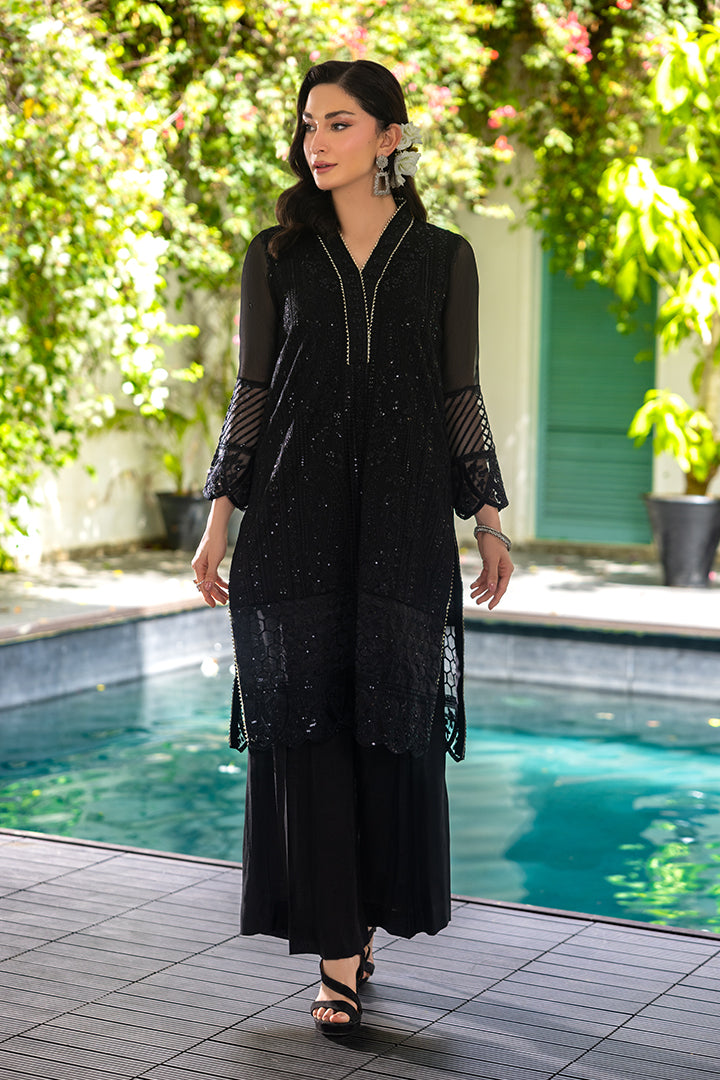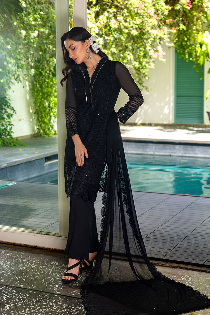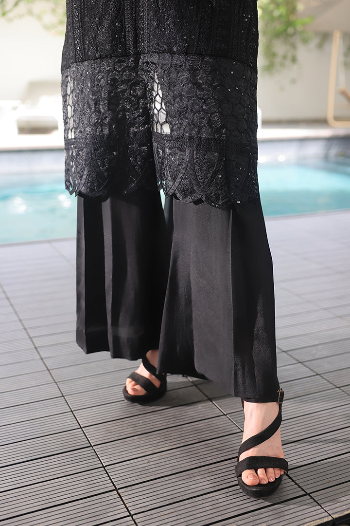 A black chiffon ensemble with detailed embroidery and organza borders, styled with a plain raw silk trouser.