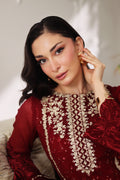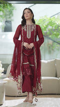 A maroon chiffon ensemble enhanced with embroidered details and organza accents, styled with a matching raw silk trouser.